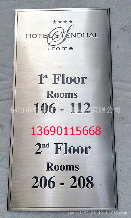 不锈钢标牌就是以不锈钢板为材料通过腐蚀、压铸或印刷等手段加工而成的广告指示牌。现阶段使用的不锈钢标牌大多数是通过腐蚀技术制作的,这样的标牌具有图案美观、线条清晰、深度合适、底面平整、色彩饱满、拉丝均匀、表面色泽一致等特点。不锈钢是一种特殊的材料,它的制作过程要比铜板、铝板难的多,但是它有良好的耐大气和淡水介质腐蚀的性能,而且通过腐蚀、抛光、拉丝后获得装饰效果十分漂亮。